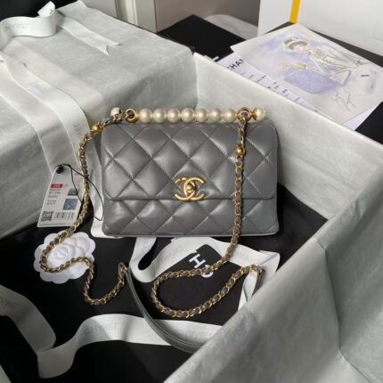 Chanel AS5001 Mini Flap Bag Top Handle Shiny Lambskin Imitation Pearl & Gold Metallic Grey