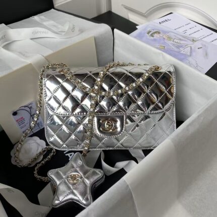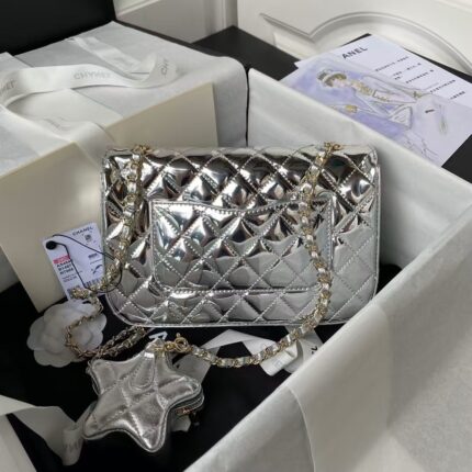 Chanel AS4647 Mini Flap Bag With Star Coin Purse Metallic Calfskin & Gold Metallic Silver