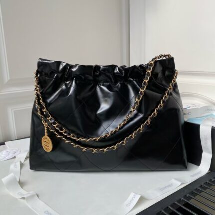 Chanel 22 Hobo Bag 24C AS4486 Gold Metallic Black Shiny Calfskin New Edition Horizontal