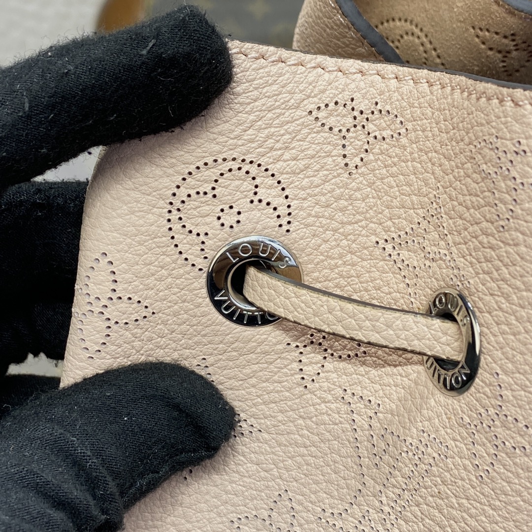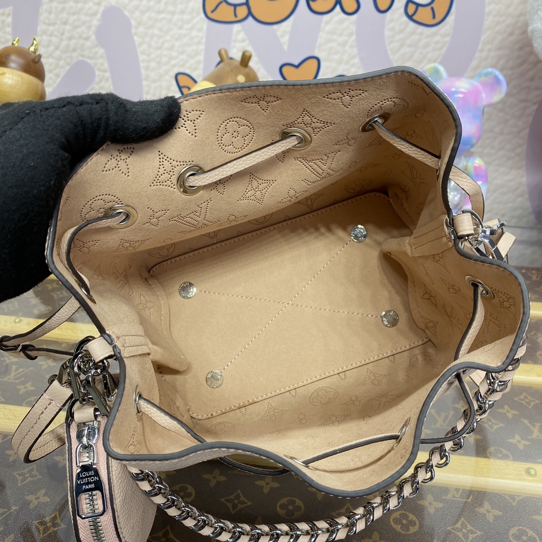 A fresh and feminine colorway brings charm to this adorable Bella bucket bag in Mahina perforated calfskin. The round coin purse in matching Mahina leather and the silver-color chain add a casual elegance to the design. The adjustable and removable leather strap enables shoulder and cross-body carry.