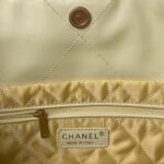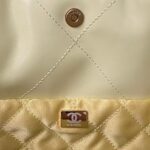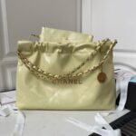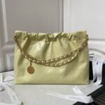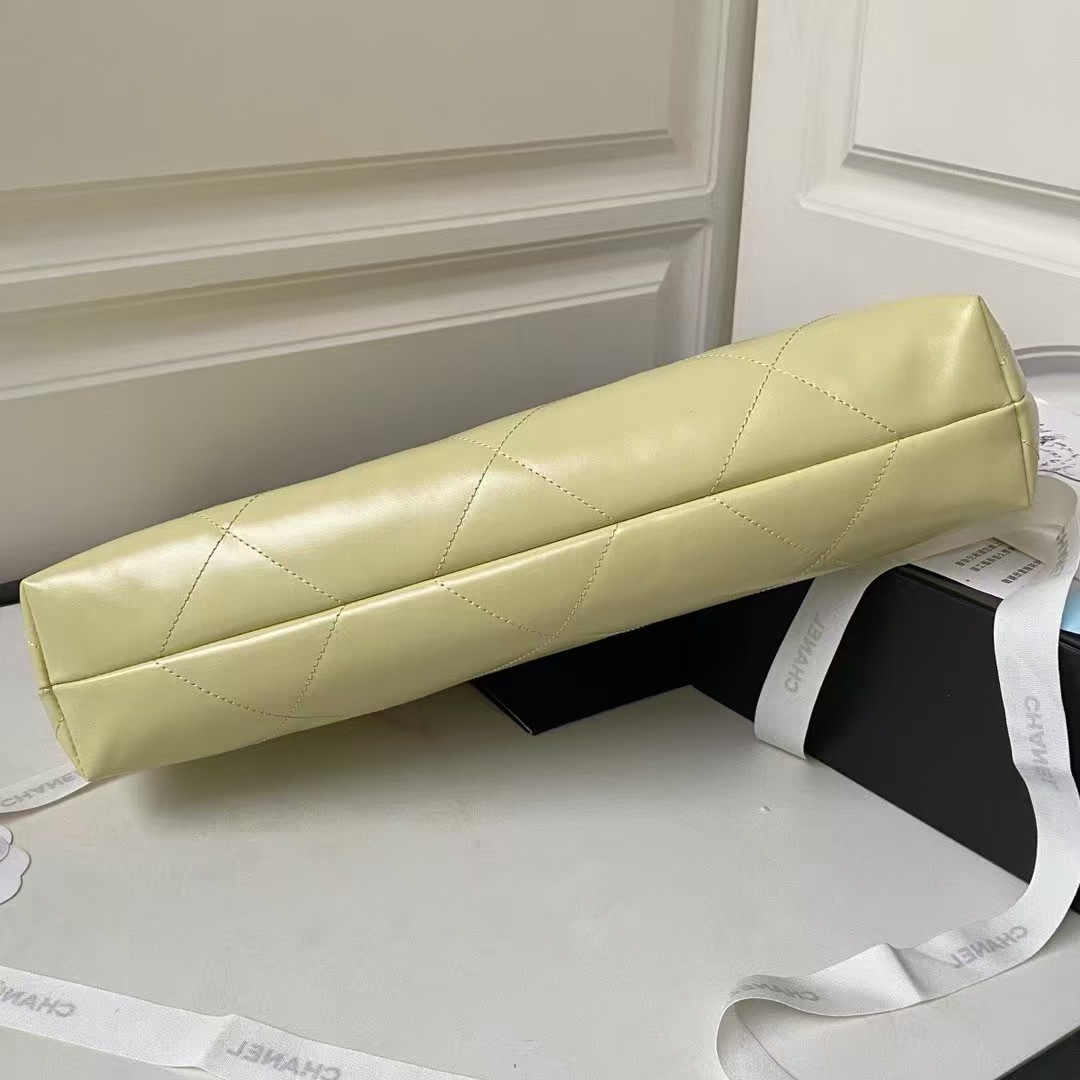 This horizontal version of the 22 Hobo Bag is made of yellow crinkled calfskin with gold-tone hardware and features signature diamond quilting, gold-tone metal CHANEL lettering on the front, a removable pouch and a long gold-tone and yellow leather chain.