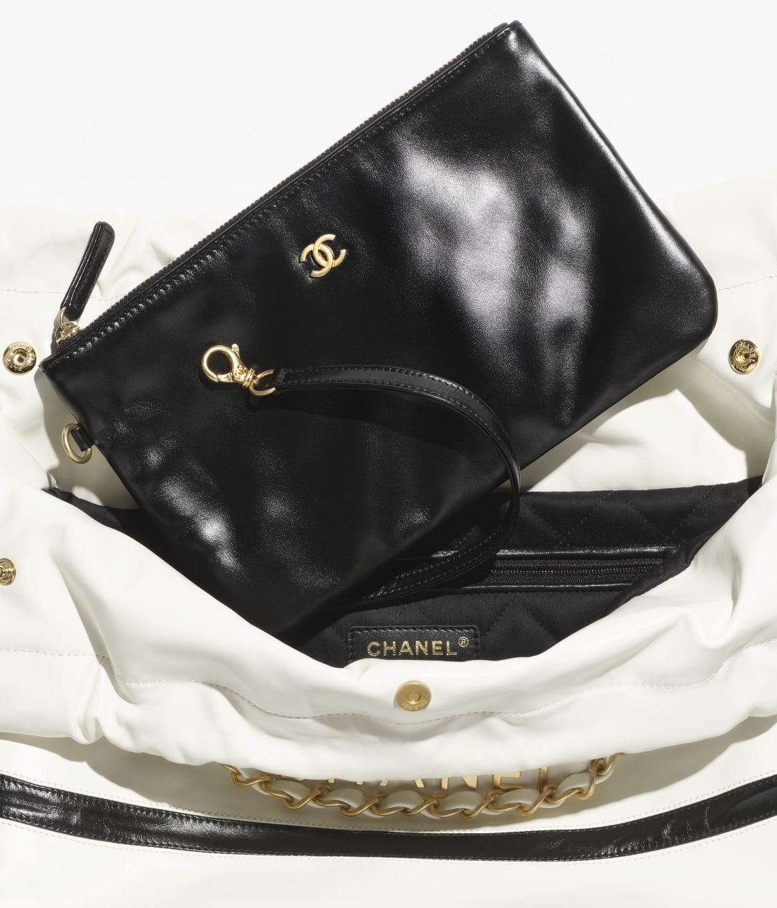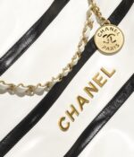 This Small 22 Hobo bag in black and white calfskin with gold-tone hardware, black interior pockets, signature diamond quilting, gold-tone metal CHANEL lettering on the front, and a long gold and white leather chain.