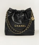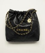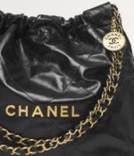 ThisSmall 22hobo bag isin Black Crumpled Calfskin with gold tone hardware and has the signature diamond quilting, CHANEL on the front in gold metal, removable pouch, and long gold tone and black leather chain.