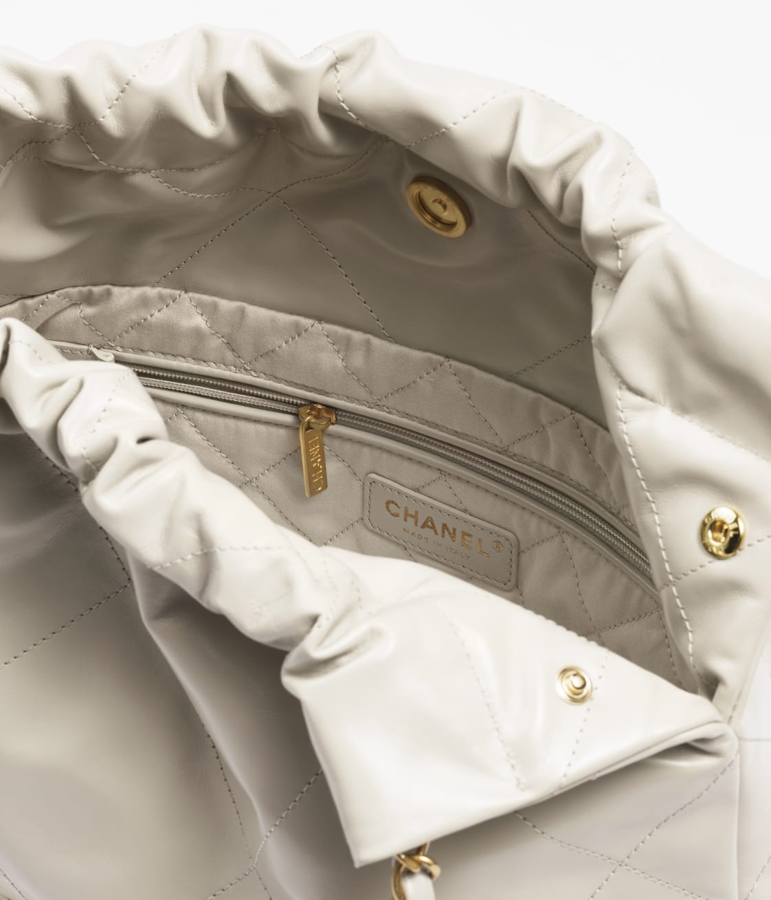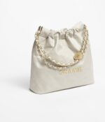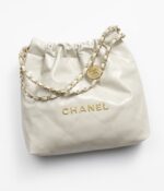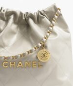 The Small 22 Hobo Bag is crafted in beige calfskin with antique gold hardware and features the signature diamond quilting, antique gold metal front with a removable pouch and a long antique gold and beige leather chain.