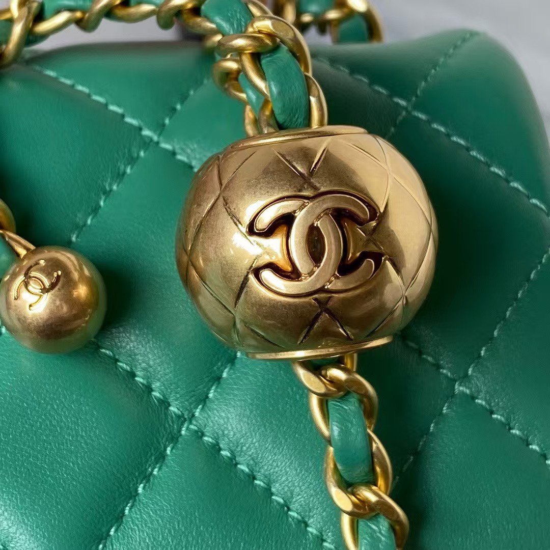 This mini rectangular pearl flap bag is crafted in green lambskin with brushed gold hardware, front flap with signature CC turnlock closure, back half-moon pocket, single interwoven green leather and brushed gold chain link shoulder/crossbody strap with adjustable pearl ball.