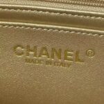 Interior lined with metallic gold leather with zippered pocket with Chanel zipper and open pocket underneath.