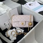 This mini rectangular pearl flap bag is crafted in light purple lambskin with brushed gold hardware, front flap with signature CC turnlock closure, back half-moon pocket, single interwoven light purple leather and brushed gold chain link shoulder/crossbody strap with adjustable pearl ball.
