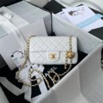 This mini rectangular pearl flap bag is crafted in white lambskin with brushed gold hardware, front flap with signature CC turnlock closure, back half-moon pocket, single interwoven white leather and brushed gold chain link shoulder/crossbody strap with adjustable pearl ball.