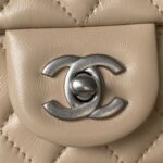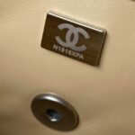 The interior is lined with apricot leather and features a zip pocket with Chanel zipper and an open pocket underneath.