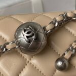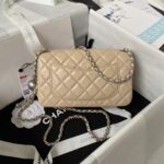 This mini rectangular pearl flap bag is crafted in apricot lambskin with brushed silver hardware, front flap with signature CC turnlock closure, back half-moon pocket, single interwoven apricot leather and brushed silver chain link shoulder/crossbody strap with adjustable pearl ball.
