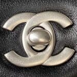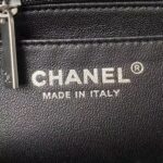 The interior is lined in black leather with a zippered pocket with Chanel zipper and an open pocket underneath.