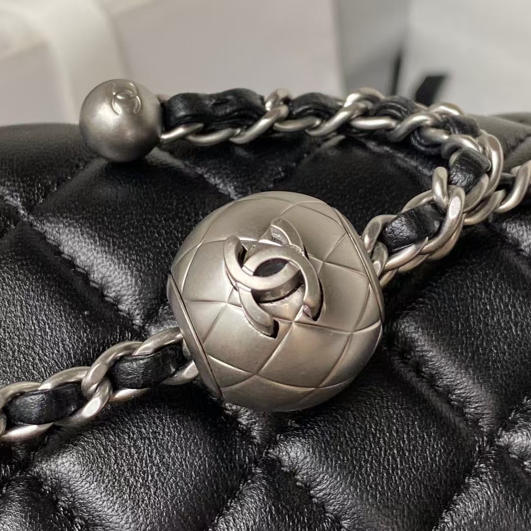 This mini rectangular pearl flap bag is crafted in black lambskin with brushed silver-tone hardware, front flap with signature CC turnlock closure, back half-moon pocket, single interwoven black leather and brushed silver-tone chain link shoulder/crossbody strap with adjustable pearl ball.
