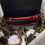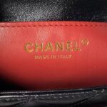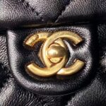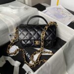 Top handle flap bag in black lambskin with light gold hardware, front flap closure with CC turnlock clasp, interwoven light gold chain links and black leather shoulder/crossbody strap.