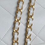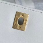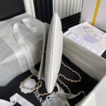This exquisite Chanel evening bag captivates with its elegant design and luxurious details. The pure black body, reminiscent of a starry night, is both simple and sophisticated. The intricate diamond pattern and iconic gold double-C logo exude understated luxury, while the unique handle adds a touch of charm and playfulness. The classic black and gold combination makes it a perfect accessory for evening events and formal attire.