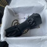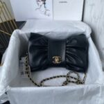 This Chanel Mini Bow Crossbody Bag is made of black shiny lambskin with light gold hardware, lambskin bow shape, signature CC logo with light gold hardware, buckle closure, black leather and light gold chain interwoven shoulder/crossbody strap.