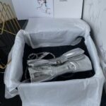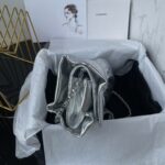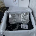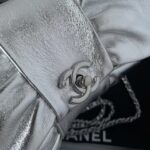 This Chanel Mini Bow Crossbody Bag is made of metallic silver shiny lambskin with light gold hardware, lambskin bow shape, signature CC logo with light gold hardware, buckle closure, silver leather and light gold chain interwoven shoulder/crossbody strap.