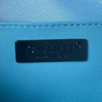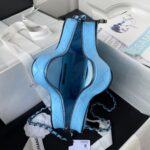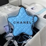 This Chanel CC Star bag is crafted in sky blue satin with black hardware and black leather trim. It features an exterior back slip pocket, a double zip top closure and interwoven black metal chain links and blue satin leather shoulder straps.