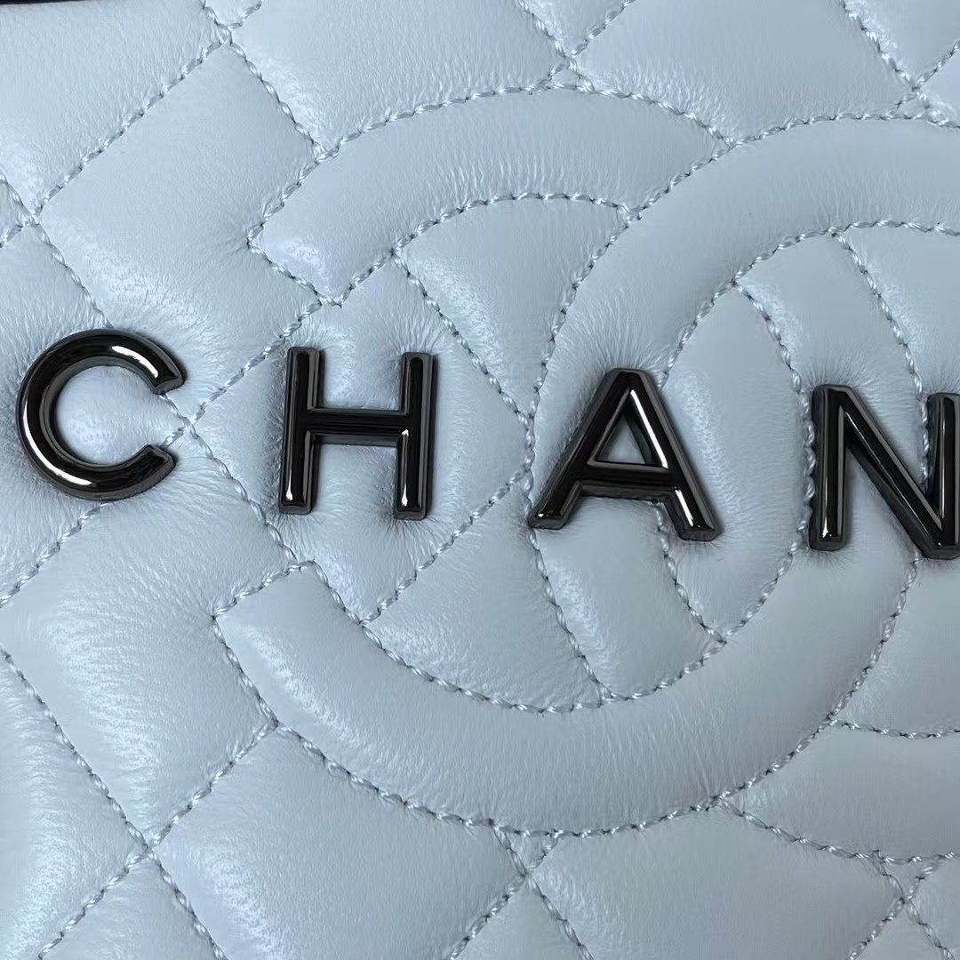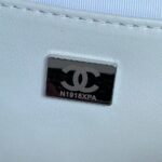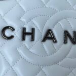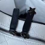 The interior is lined with white grosgrain canvas and white leather with two open slip pockets on each side wall.
