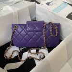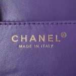 This CC shoulder bag is made of purple lambskin with antique gold hardware, tonal stitching, square construction, large antique gold CC clasp that folds over the front top of the bag.