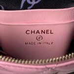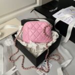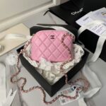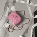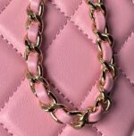 This Chanel mini chain crossbody bag is crafted from pink caviar leather with light gold hardware, signature diamond quilting, light gold CC logo printed on the front, zip closure, half-moon back pockets, and an interwoven pink leather and light gold chain shoulder/crossbody strap.