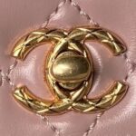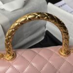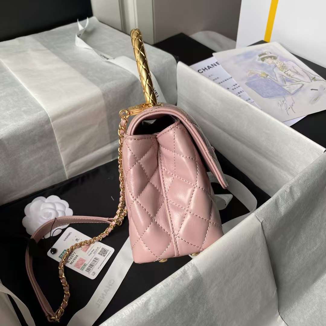 This small rectangular flap bag features a metal top handle and is made from pink shiny calfskin with gold hardware, front flap with CC turnlock closure, half-moon back pocket, top handle and single interwoven antique gold chain link and pink leather shoulder/crossbody strap.