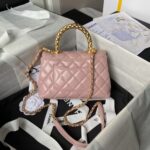 This Chanel Mini Rectangular Flap Bag features a metal top handle, made from pink shiny calfskin with gold hardware, front flap with CC turnlock closure, half-moon back pocket, top handle and single interwoven antique gold chain link and pink leather shoulder/crossbody strap.