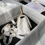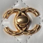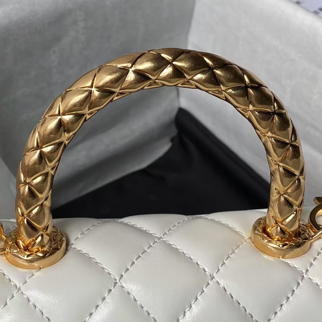 This Chanel Mini Rectangular Flap Bag features a metal top handle, crafted from white shiny calfskin with gold hardware, front flap with CC turnlock closure, half-moon back pocket, top handle and single interwoven antique gold chain link and white leather shoulder/crossbody strap.