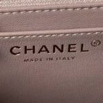 The Interior is lined in light pink lambskin leather and has one slip pocket on back wall.