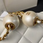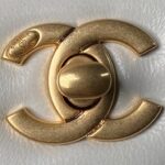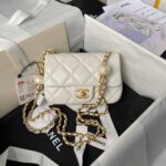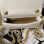 This Chanel Mini Flap Bag is made of white lambskin with antique gold hardware, the front flap closes with the signature CC turnlock clasp, tone-on-tone stitching and an adjustable interwoven antique gold chain link and white leather shoulder strap with “pearl” ball attachment.