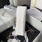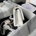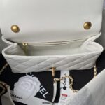 This Chanel Pearl Top Handle Flap Bag in white glossy lambskin with gold-tone hardware features signature diamond quilted leather, front CC turnlock closure, rear exterior pocket, and gold-tone and pearl top handle leather shoulder strap.