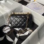 This Chanel Mini Pearl Top Handle Flap Bag is crafted in black shiny lambskin with gold tone hardware, featuring signature diamond quilted leather, CC turnlock closure on the front, exterior pocket on the back, and black and pearl top handle leather shoulder strap.