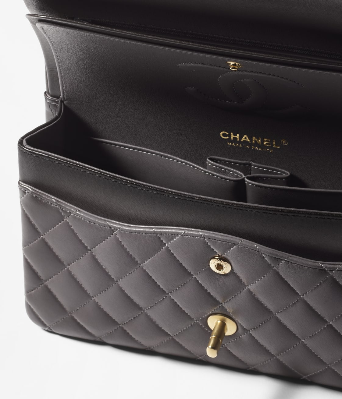 The interior is lined with dark grey leather and has a zip pocket with logo zipper on the back wall and an open pocket on the back wall below the zip pocket.