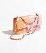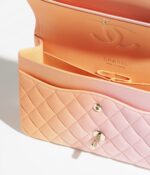 This classic double flap bag is crafted from pink iridescent lambskin with silver hardware, featuring the signature CC turnlock closure on the front flap, half-moon back pockets, adjustable silver interwoven chain links and a pink leather shoulder strap.