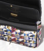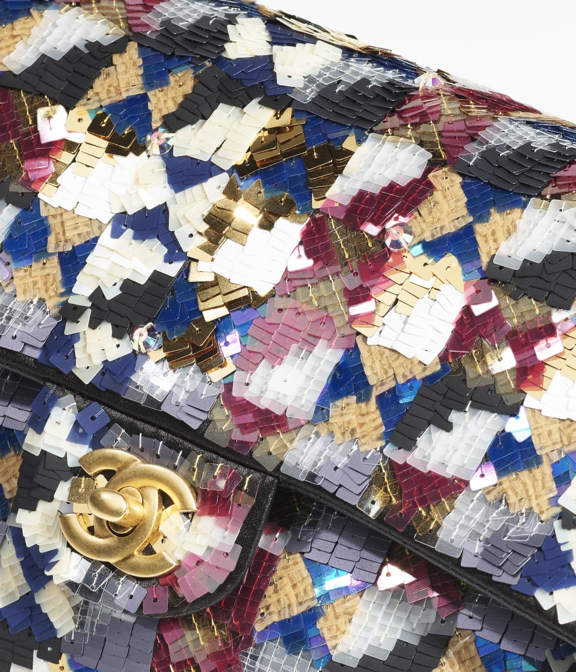 Measurements:6 in height x 9.9 in length x 2.5 in widthMeasurements:15.5cm height x 25.5cm length x 6.5cm widthEmbroidered Satin, Sequins & Gold-Tone Metal Classic Flap BagEmbroidered Satin, Sequins & Gold-Tone MetalBlack & Multicolor