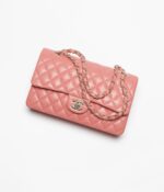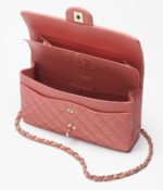 This flap bag is made of coral lambskin with gold-tone hardware, front flap with signature CC turnlock closure, half-moon back pocket, adjustable gold-tone interwoven chain link and coral leather shoulder strap.