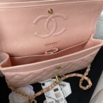 This medium classic double flap bag is crafted in pink caviar leather with light gold hardware, featuring the signature CC turnlock closure on the front flap, half-moon back pocket, adjustable interwoven light gold chain and pink leather shoulder strap.