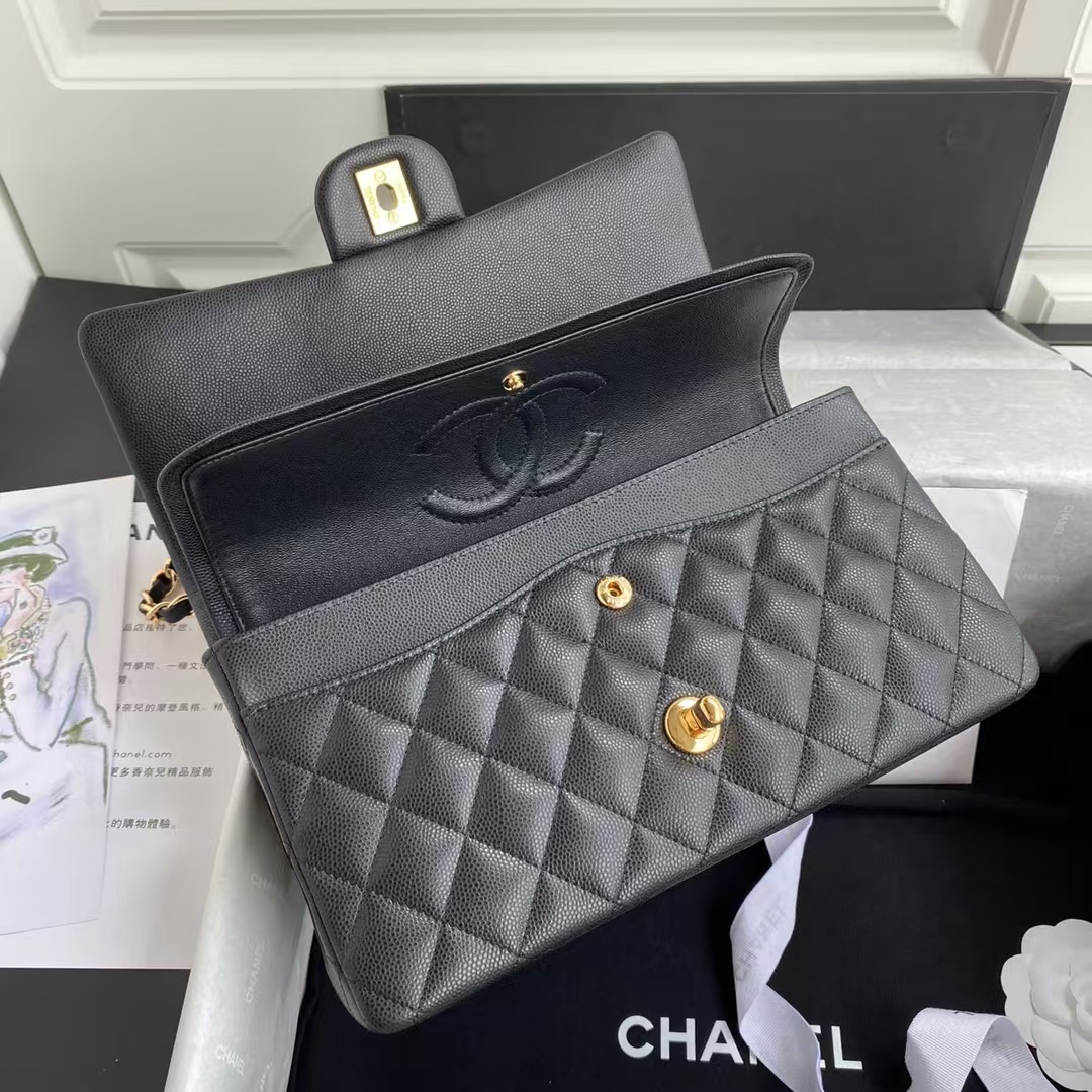 This medium classic double flap bag is crafted in black caviar leather with gold hardware, featuring the signature CC turnlock closure on the front flap, half-moon back pocket, adjustable interwoven gold chain and black leather shoulder strap.