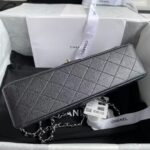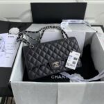 This medium classic double flap bag is made of black caviar leather with silver hardware, signature CC turnlock closure on the front flap, half-moon back pocket, adjustable interwoven silver chain and black leather shoulder strap.