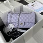 This medium classic double flap bag is crafted in light purple lambskin with silver hardware, front flap with signature CC turnlock closure, half-moon back pocket, adjustable interwoven silver chain and light purple leather shoulder strap.