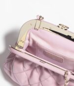 This Chanel Cloud Bag is made of pink lambskin with gold hardware, front CC logo in quilted satin, pink leather, top CC Kiss lock, interwoven gold-plated chain links and pink leather shoulder/crossbody strap