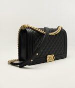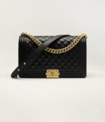 This Chanel Large Boy Bag is crafted in black lambskin leather with gold hardware, tone-on-tone stitching, front flap with Le Vintage Boy CC snaps, smooth leather trim, bronze gold chain links and black leather shoulder strap.