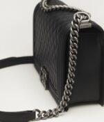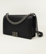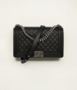 This Chanel Large Boy Bag is crafted in black lambskin with ruthenium hardware and features a full front flap, Le Boy CC snaps and ruthenium-toned chain links, and a black leather padded shoulder/crossbody strap.