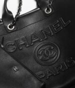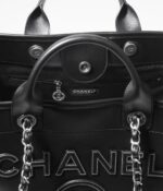 This large shopping bag is made of black calfskin with silver hardware, large CC and Chanel logo on the front, removable pouch, interwoven light gold chain links and black leather shoulder strap.