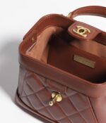 This Chanel Mini Top Handle Flap Bag is crafted in brown shiny lambskin with light gold hardware, the trapezoidal design features signature diamond quilting, signature interlocking CC clasp, top handles and a long light gold and brown leather chain.