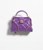 This Chanel Mini Top Handle Flap Bag is crafted from purple shiny lambskin with light gold hardware, the trapezoidal design features signature diamond quilting, signature interlocking CC clasp, top handles and a long light gold and purple leather chain.