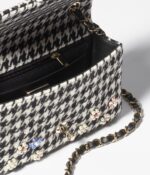 This Chanel Mini rectangular flap bag is interwoven with tweed and pearls and features light gold hardware, a front flap with CC turnlock closure, half-moon back pockets, interwoven light gold chain links and a black shoulder/crossbody strap.