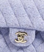 This mini classic rectangular flap bag is made of purple tweed with gold hardware, front flap with CC turnlock closure, half-moon back pocket and interwoven gold chain links and purple leather shoulder/crossbody strap.