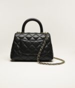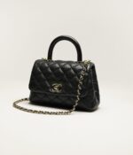 This mini rectangular flap bag features a top handle and is made of black lambskin with gold hardware, front flap with CC turnlock closure, half-moon back pocket, top handle and black leather shoulder/crossbody strap.