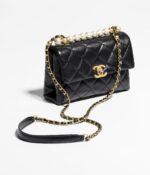 This Chanel Mini Square Pearl Flap Bag is crafted in black lambskin with brushed gold hardware, front flap with signature CC turnlock closure, tonal stitching, rear half-moon pocket, single interwoven black leather and brushed gold chain link shoulder/crossbody strap, and pearl and chain top handle strap.