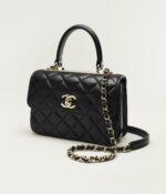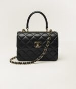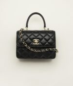 This mini rectangular flap bag features a top handle and is made of black lambskin with gold hardware, front flap with CC turnlock closure, half-moon back pocket, top handle and black leather shoulder/crossbody strap.